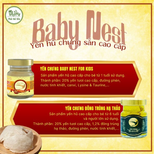 - Yến chưng Đông Trùng Hạ Thảo Baby Nest: bổ sung 1,2% đông trùng hạ thảo kết hợp yến tươi, hỗ trợ nhu cầu dinh dưỡng của người trưởng thành.