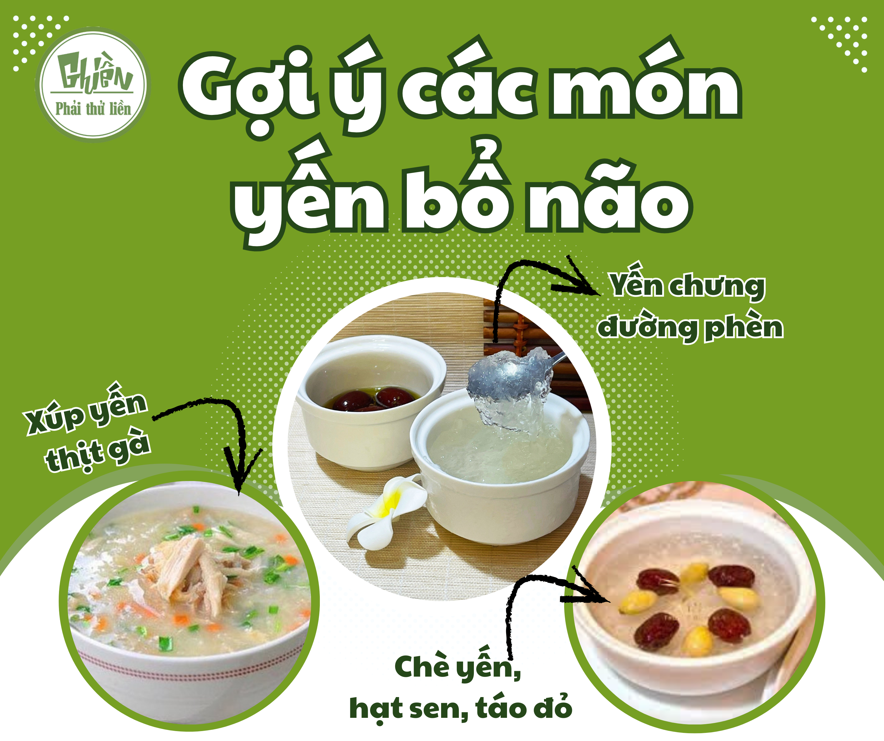 Để bổ não và giúp học sinh tỉnh táo trong mùa thi, ba mẹ có thể chế biến các món từ yến như: yến chưng đường phèn để giải tỏa căng thẳng, xúp yến thịt gà bổ sung năng lượng và protein, hay yến chưng hạt sen – táo đỏ giúp thư giãn, cải thiện giấc ngủ. Các món yến gợi ý cho mùa thi mẹ nên bổ sung cho con: